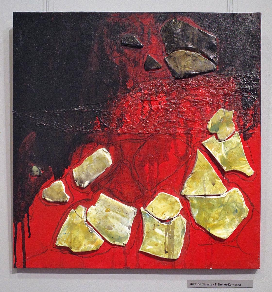 Pejzaż z ceramiką, akryl na płotnie, asamblaż, 50x50cm