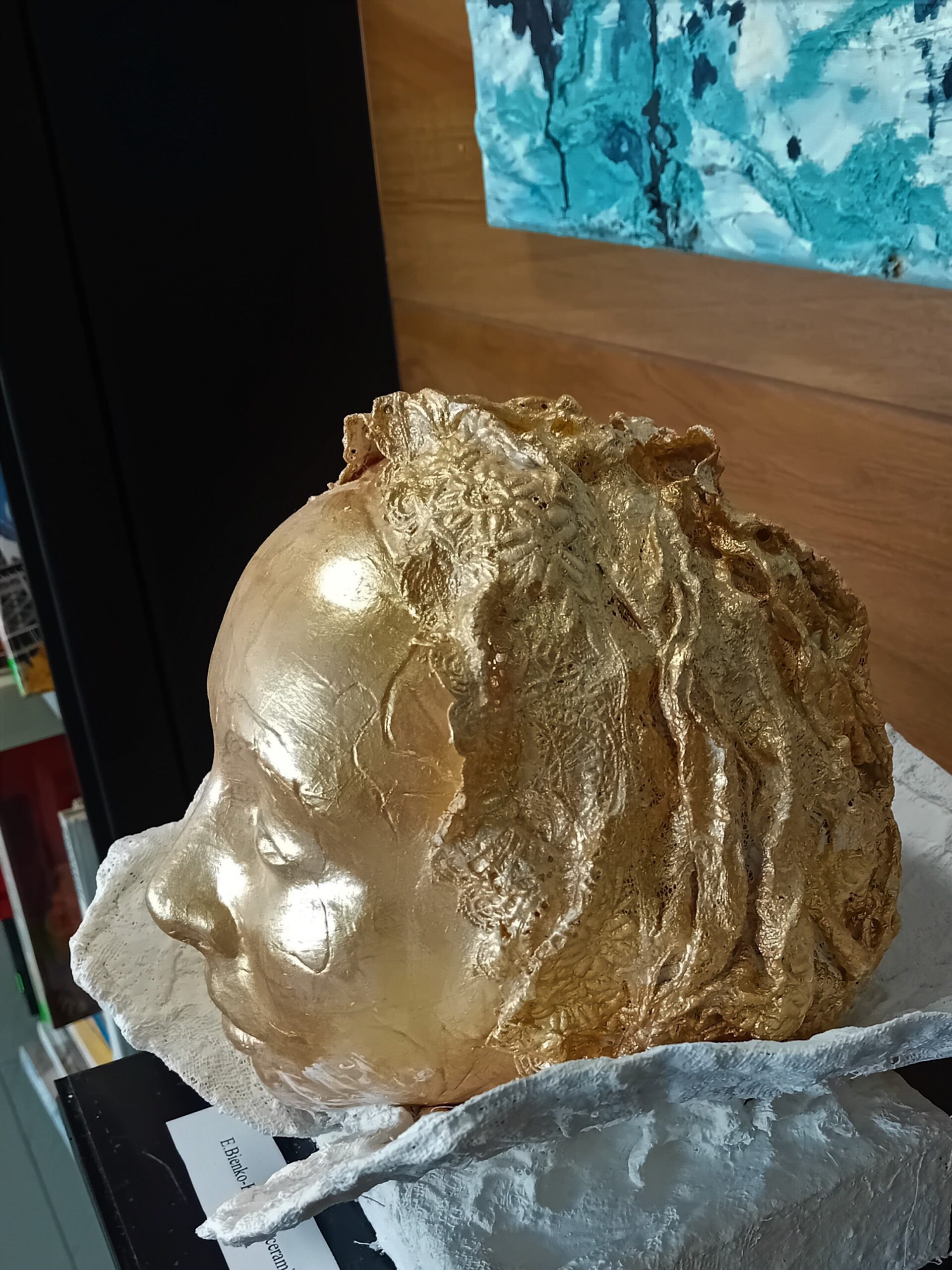 Głowa kobiety, glina wypalana i szkliwiona, na lipowej podstawie, wym. 30×17 cm