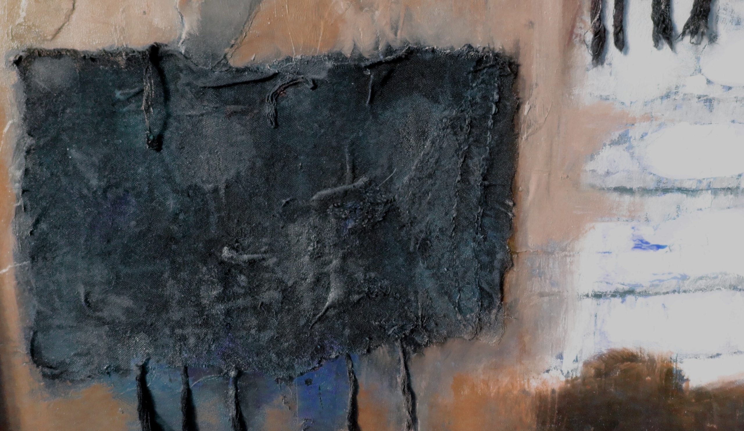 Dialog I, olej i akryl na płycie, kolaż, wymiary 100 x 70 cm.