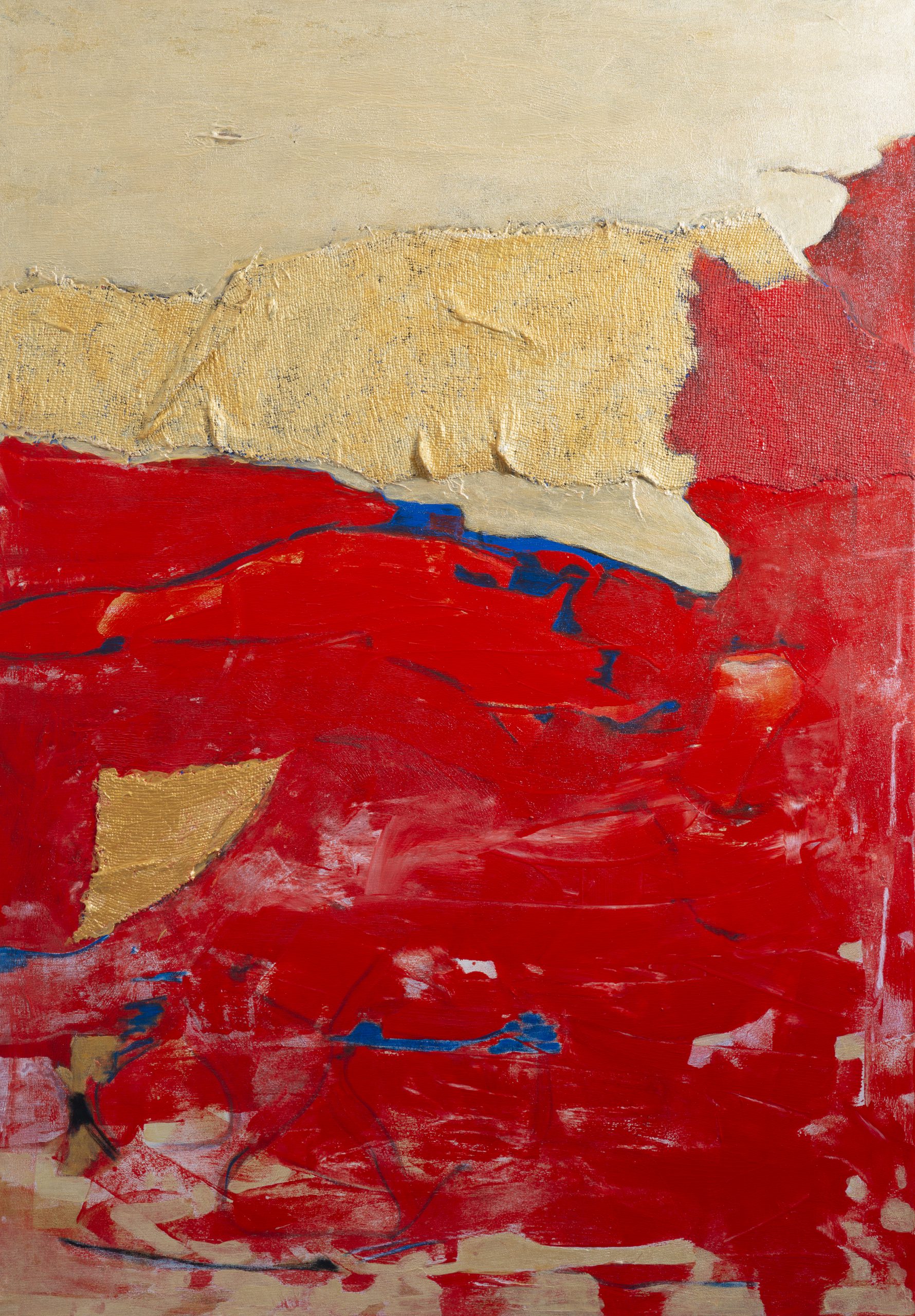 Pejzaż w czerwieni i złocie, akryl i kolaż na plótnie 100x70cm, 2022
